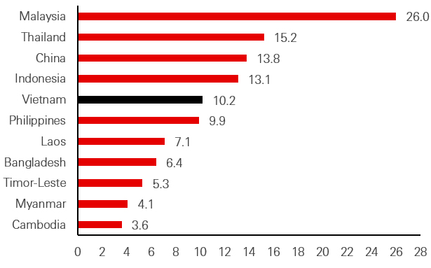Currently, Vietnam’s inexpensive labour force does not boast high labour productivity. While manufacturing and trade has grown exponentially, local value-add remains low. Government investment in upskilling the workforce can be seen via steadily improving labour productivity. However, in the context of its Asian neighbours, more progress will be needed to capture greater value locally that supports opportunities for a more skilled workforce and insulates the country from competing supply chain locations.