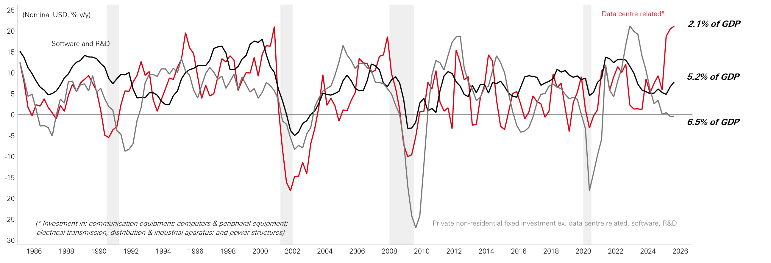 The late-1990s dotcom period provides a potentially useful historical precedent for today’s AI investment cycle. Then, a multi-year investment surge lifted the investment-to-GDP ratio by approximately 2 per cent, following a period of subdued capex. The present cycle appears similar in scale, although the early phase has unfolded faster. History suggests that such booms tend to run for several years rather than one or two, and that they often end with some degree of retrenchment once overcapacity becomes apparent. At this stage, however, available data point to an ongoing boom rather than an imminent reversal.